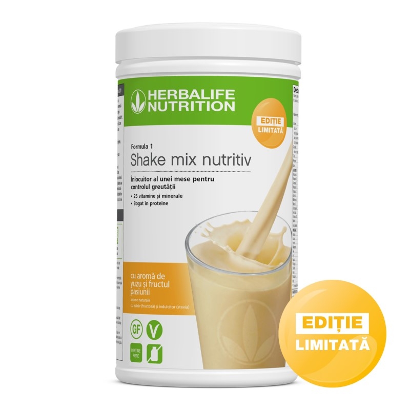 Savurează Formula 1 cu aromă de Yuzu și Fructul Pasiunii în ediție limitată în fiecare zi, echivalent cu o masă nutritivă. Agită ușor recipientul înainte de fiecare utilizare, deoarece conținutul se poate sedimenta. Pentru a prepara un shake delicios, amestecă două măsuri de pudră (26 g) cu 250 ml de lapte rece, semi-degresat (1,5% grăsime) sau pentru un shake vegan și fără lactoză în mod natural, amestecă Formula 1- două măsuri de pudră (26 g) cu 250ml de băutură din soia.